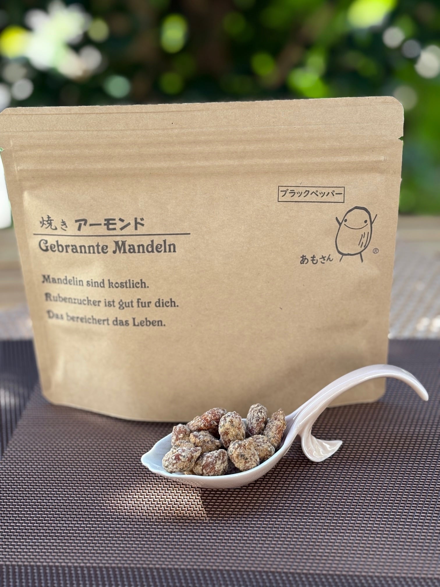 あもさん焼きアーモンド『ブラックペッパー』は、厳選されたアーモンドに北海道産てんさい糖とピリッと刺激的なブラックペッパーを加えた特別な一品です。やさしい甘さの後に訪れる刺激的な味わいで、一度食べると忘れられない大人の贅沢感が楽しめます。日常のおやつやティータイムにはもちろん、自分へのご褒美、大切な方への贈り物にも最適です。
