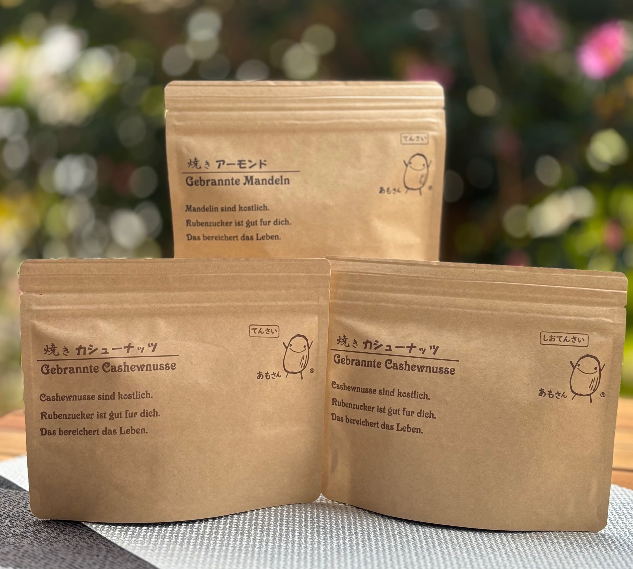 ・内容量:あもさん焼きアーモンド『てんさい』100g、あもさん焼きカシューナッツ『てんさい』90g、あもさん焼きカシューナッツ『しおてんさい』90g