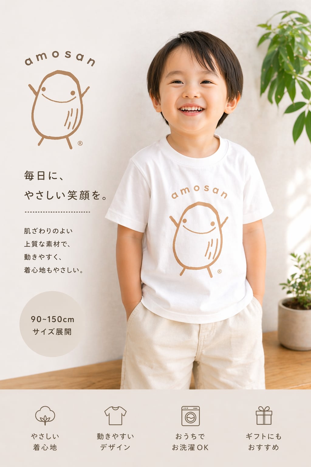 あもさんキッズTシャツは、海外で丁寧に生産し、日本国内でこだわりのデザイン加工を施した、心地よい着心地の一枚です。やさしいデザインで、元気に動き回る姿やちょっとしたしぐさも、そのままでかわいさを引き立てます。毎日のお出かけや、遊び時間にぴったりなアイテムです。